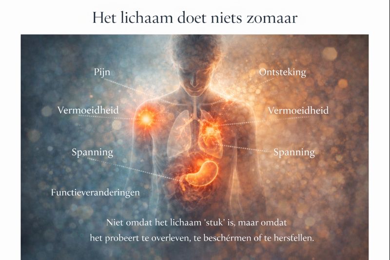 Het lichaam reageert op wat het heeft meegemaakt — fysiek, emotioneel of innerlijk — en zoekt telkens naar een manier om in leven te blijven en evenwicht te bewaren.